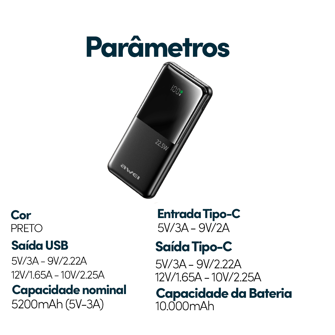 Capacidade da bateria 10000mAh (3.7V/37Wh)