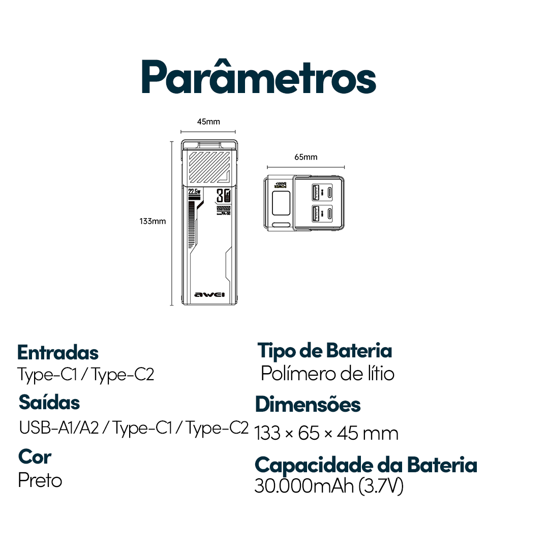 Saída Tipo-C1/C2 5V/3A - 9V/2.22A - 12V/1.67A