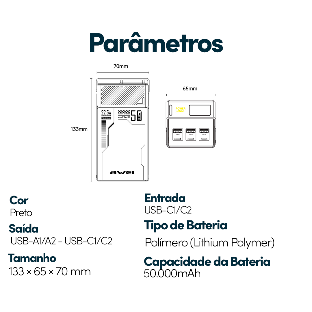POWER BANK AWEI PA-33 CARGA RÁPIDA E MULTIPLAS ENTRADAS 50000MAH PRETO