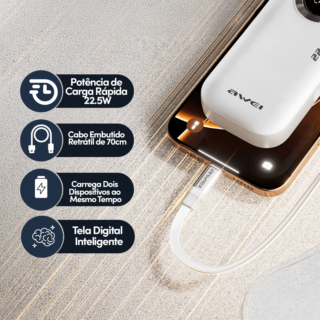 POWER BANK AWEI PA-9 22,5W COM CABO RETRÁTIL INTEGRADO 10000MAH BRANCO